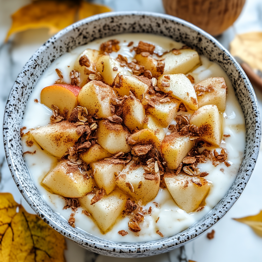 Start your day on a delicious note with this Apple Cinnamon Yogurt Bowl, a delightful breakfast that combines the creamy richness of yogurt with the warm and inviting flavors of apple and cinnamon. This recipe is not only quick to prepare but also packs a nutritional punch, making it the perfect choice for busy mornings or a leisurely brunch. With just a few simple ingredients, you can create a satisfying meal that feels indulgent while still being healthy. The base of Greek yogurt provides protein and probiotics, promoting gut health and keeping you full longer. cinnamon-infused breakfast treat Topped with sweet sautéed apples and a sprinkle of cinnamon, it’s a comforting bowl that brings both flavor and nostalgia. In under 15 minutes, you’ll have a wholesome dish ready to enjoy. Whether you’re looking for something to fuel your morning routine or a refreshing snack throughout the day, this Apple Cinnamon Yogurt Bowl is sure to become a favorite in your household.