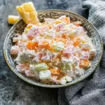 Ambrosia Salad can be adapted to fit various dietary needs with some adjustments! For those who are gluten-free or dairy-free, you can easily substitute traditional whipped cream with coconut whipped cream or another non-dairy alternative while ensuring all other ingredients are gluten-free as well! In terms of sugar content control—for those watching their sugar intake—using fresh fruits instead of canned options often provides natural sweetness without additional sugars found in syrupy cans! Always check labels carefully if you’re unsure about specific dietary restrictions.